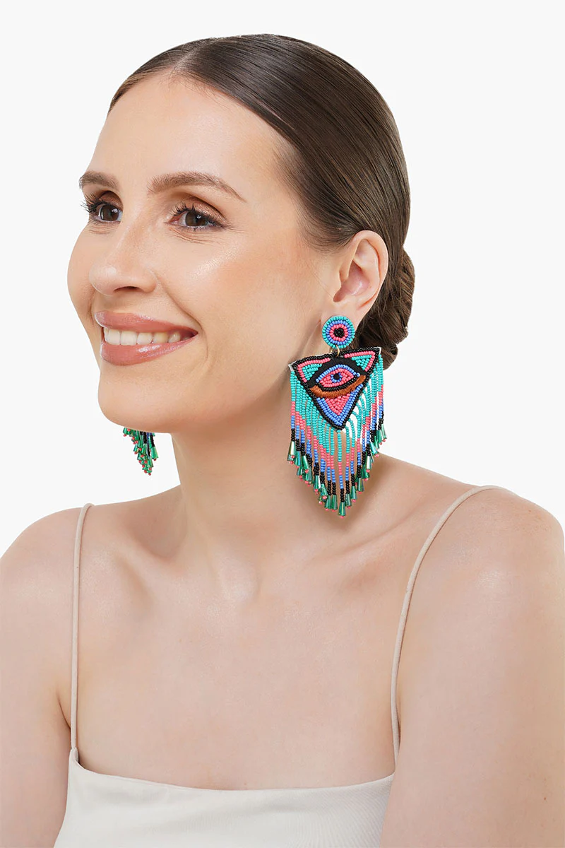 Handcrafted with meticulous attention to detail, these earrings feature a unique triangle shape adorned with delicate beads. The centerpiece of each earring is a captivating evil eye motif surrounded by intricate beaded fringes.