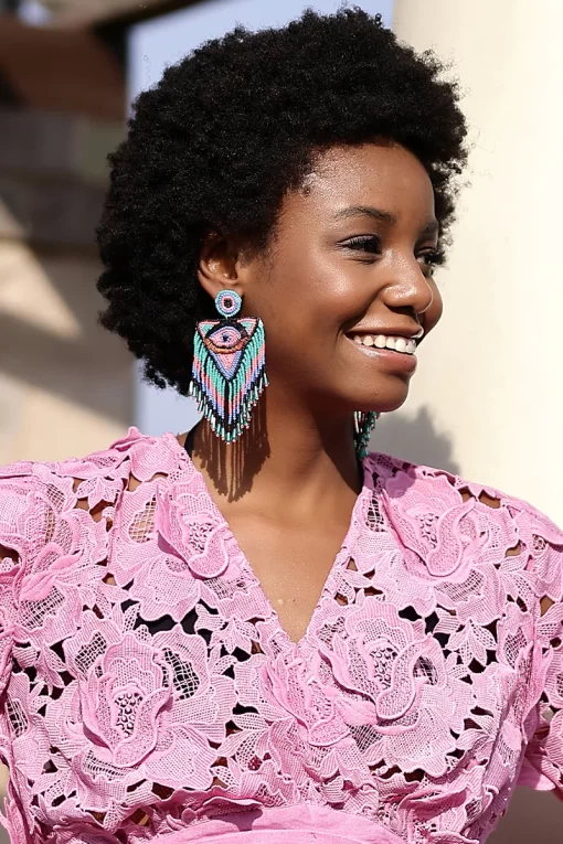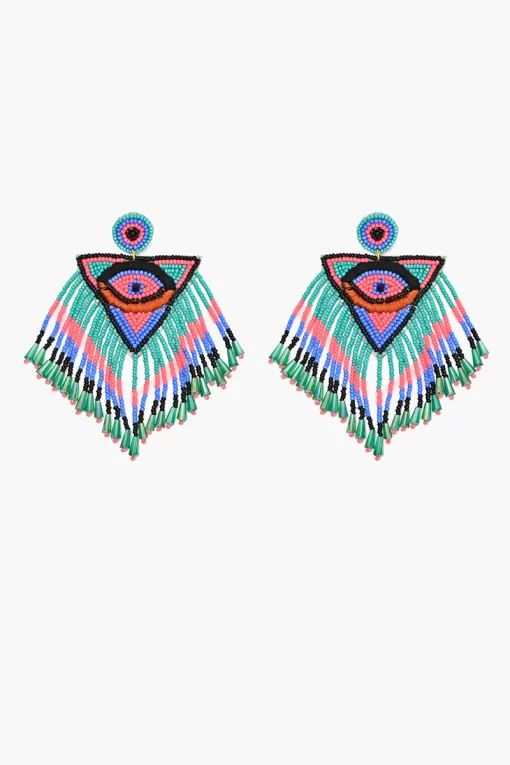 Handcrafted with meticulous attention to detail, these earrings feature a unique triangle shape adorned with delicate beads. The centerpiece of each earring is a captivating evil eye motif surrounded by intricate beaded fringes.
